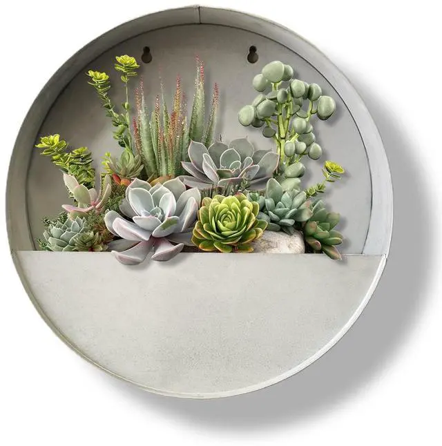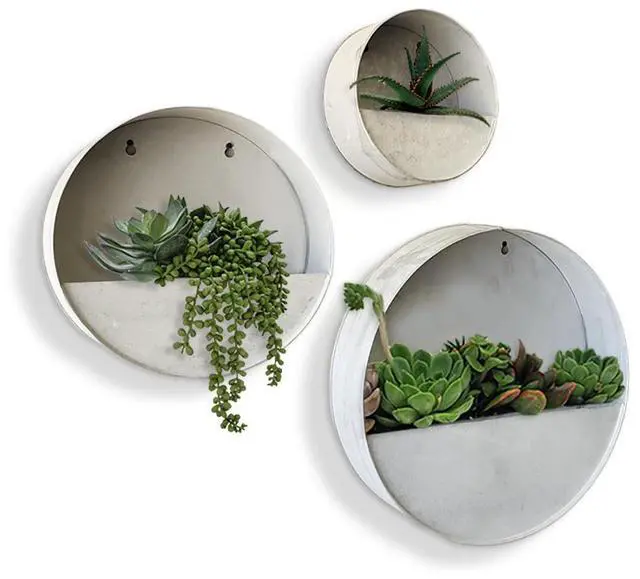 The Modern Home Living Wall Succulent Planter will create a beautiful conversation piece anywhere in your home or office be it indoors or outdoors. Constructed of galvanized steel with a variety of patinas, each wall planter offers a whimsical wall-mounted planter in various sizes designed to hold individual succulents or other small plants. Each round planter can be call mounted using the 2 pre-drilled wall slots. The Round Living Wall planter is offered in a variety of colors and sizes. Seasonal succulents are an aesthetically pleasing living plant with many variations. It is incredibly easy to make a quick arrangement from loose succulents and mix/match as you create your own living artwork.