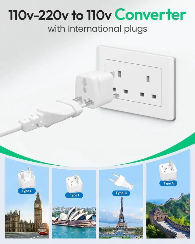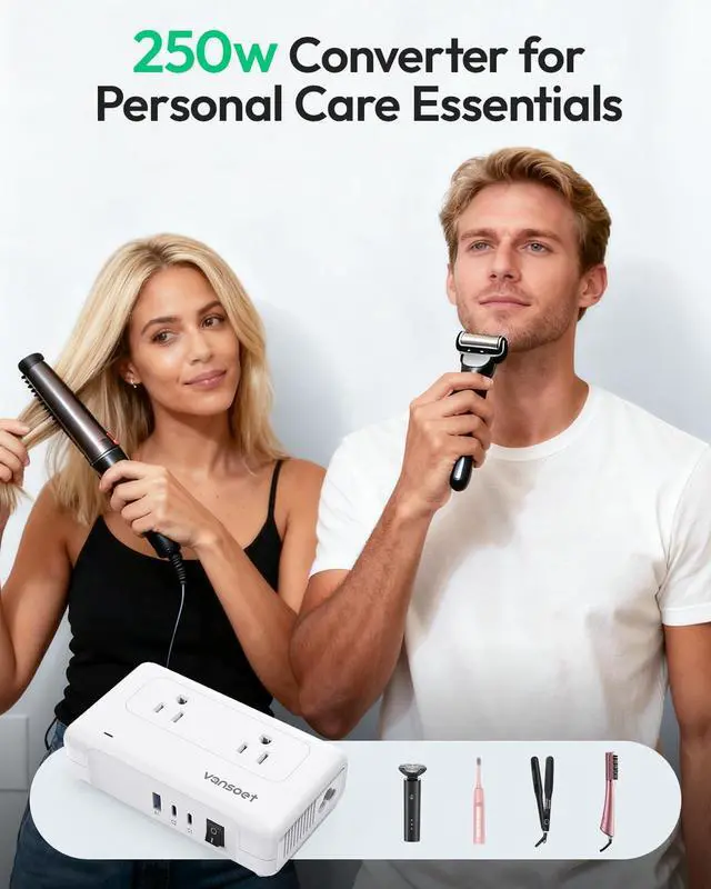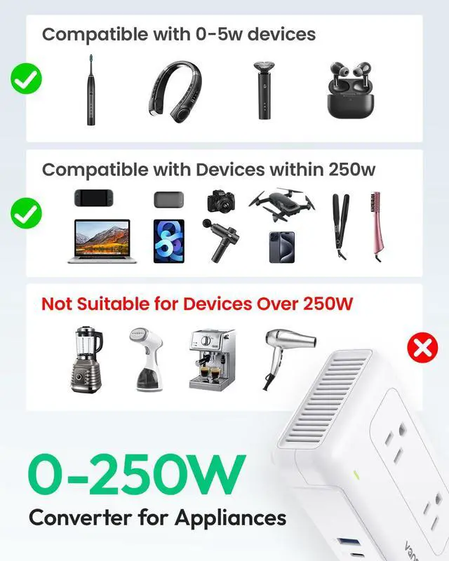Wide Use: The travel converter supports devices from 0 to 250 watts, perfect for most low to medium-power appliances, such as hair straighteners, curling irons, electric toothbrushes, electric shavers, sprayer, game console, Kindle, laptop mobile phone, etc. (Note: This product is not suitable for high-power devices above 250 watts, such as hair dryers, coffee makers, and electric irons.)
