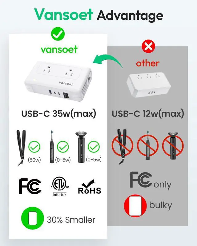 Durable Housing: VANSOET POWER CONVERTER provides advanced protection from drops and bumps. Smart cooling fan system makes the converter very quick heat dissipation when operating,and the fan runs faster when the device gets warmer or output power exceeds a certain limit.