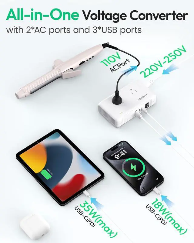 USB C 35W: This voltage converter with 2USB C PD 35W and 1 USB-A port, it can charge all mobile phones such as iphone13/13Pro/iphone12/iphone8 Plus, Galaxy S10/S20/S21/S22, Note 20/10/9/8, Pixel 3a/3XL/3/2XL/2, and Android devices.