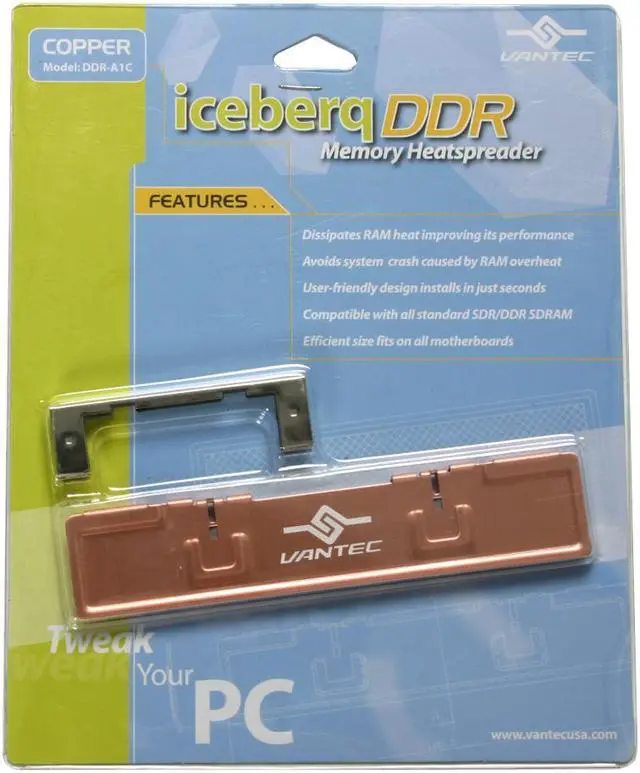 Excellent Heat DissipationCompatible with all standard SDR/DDR SDRAM, the VANTEC ICEBERG DDR-A1C heatsink effectively dissipates heat on the memory chip for improved system performance.