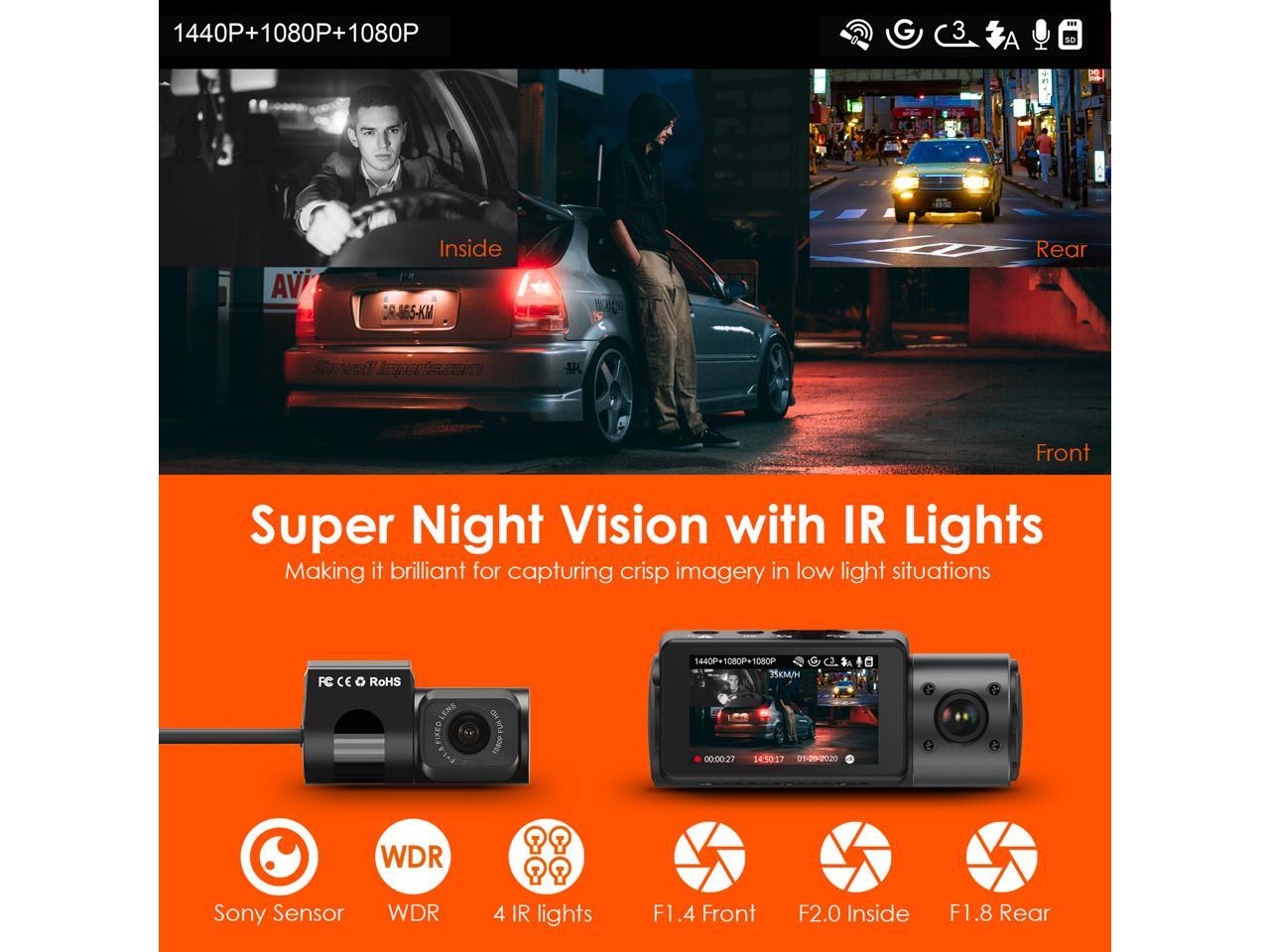 3 Channel Dash Cam - The N4 offers 155° front camera, 165° inside camera and 160° rear camera to record front, inside cabin and road back simultaneously at 1440P+1080P+1080P at 30fps.