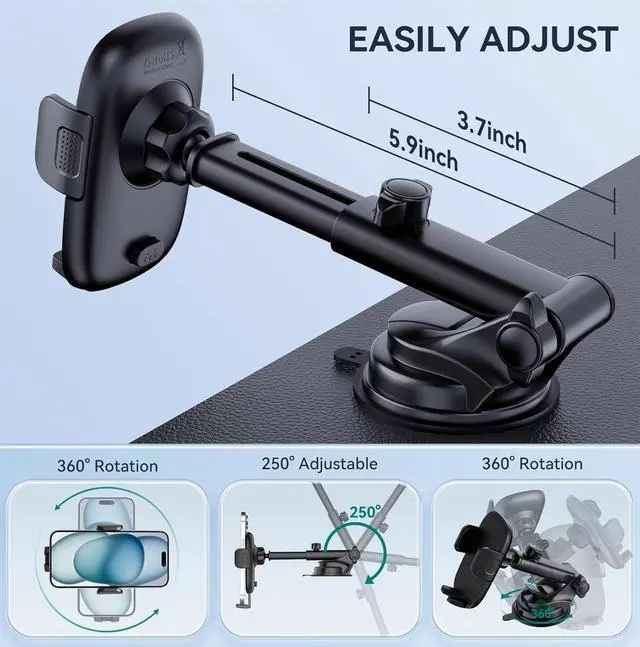 Strong Suction Cup: iPhone car mount adapts with heat-resistant TPU material suction which can be used normally in extreme heat or cold environments. No worries about stickers melting. With a high-durability strength base, it can provide strong suction when pressing the suction button lock on smooth surfaces. Not contaminated by dust, just wash it with warm water to easily restore it. Unlimited Freedom: Phone mount for car cradles not limited by the angle of space. The adjustable telescopic arm extends from 3.7 inches to 5.9 inches. The 360° ball joint allows your phone mount to be installed at any angle and distance as your please. Super Installation Compatibility: No matter what type of car you drive, the car cell phone holder is equipped with suction cup and air vent clip, and you can freely choose to install phone mount on the dashboard, windshield and air vents, and can be used in multi-scene. Convenient One-hand Operation: Car phone holders for iPhone are equiped with a one-touch release button on the back of the holder allows you to quickly release and mount your phone. The bottom suction cup provides 360° random rotation, after turning on the suction cup locking button, you can turn the suction cup at will to adjust to the right angle without removing the suction cup for reinstallation Car Phone Companion: Phone stand for car has large-sized adjustable feet fit all 4.0-7.1-inch smartphones and other devices with thickness 14 mm. The extra thick airbag silicone layer clip arms provides a stable grip and protection, ensure your iPhone is scratch-free.