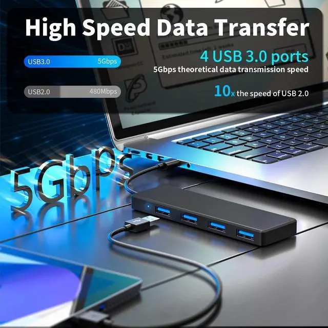 Ultra Slim 4-Port USB 3.0 Data Hub, Widely used in mouse, keyboard, U disk, card reader, hard disk, printer, desktop fan and other devices with USB interface. Perfectly resolve the issue of insufficient USB ports on your laptop.