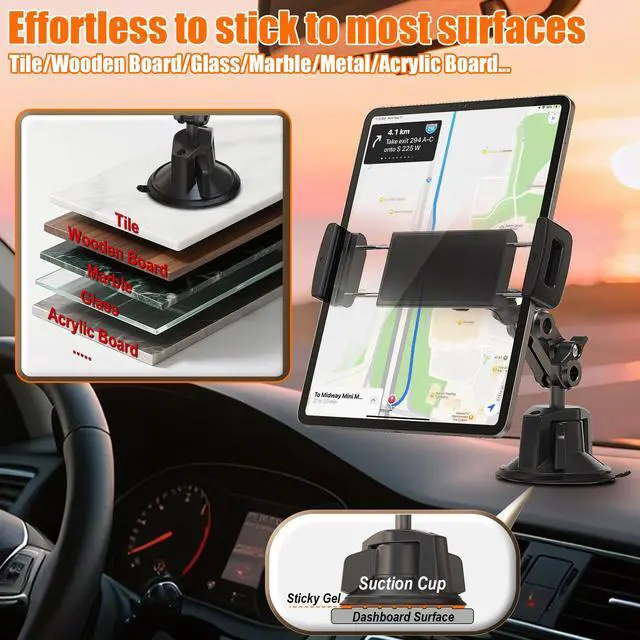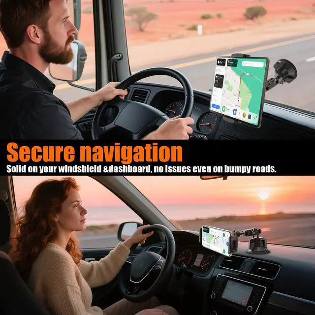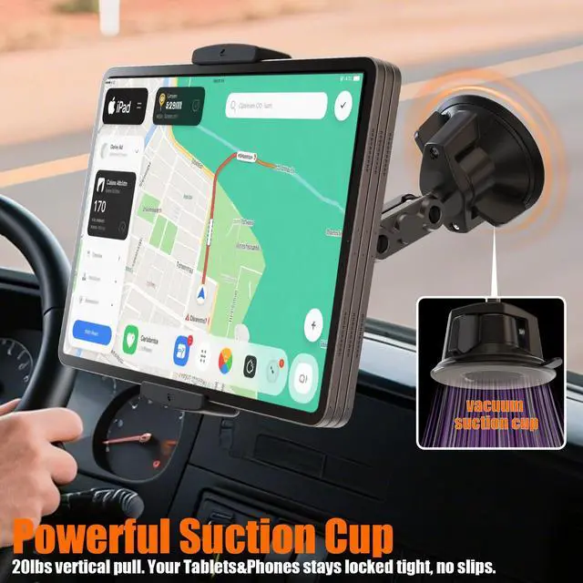 Heavy Duty Tablet MountThis car tablet mount comes with an ultra-strong suction cup that locks onto any smooth, flat surface easywindshields, sleek dashboards, desks, walls, mirrors. Fits cars, trucks, semi-trailers, commercial vans, and more. As a reliable tablet holder for trucks, its metal magic arm adjusts effortlessly while staying rock-solid, keeping your phone or tablet steady even on bumpy roads.