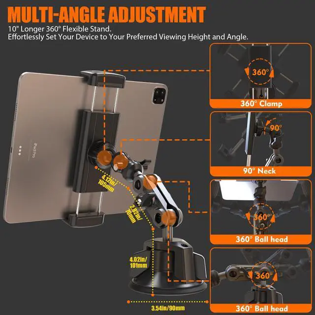 Multi-Angle Rotation: The ball head of this iPad mount rotates 360 degrees, meeting your needs for both horizontal and vertical screen use with tablets and phones. The metal arm adjusts 360 degrees with a quick screw turncovers all your angle needs. Whether navigating, listening to music, or taking calls while driving, youll get a clear, unobstructed view. Safe, comfy, simple as that.