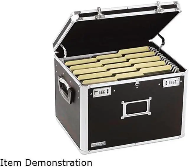 Locking chest holds letter-size or legal-size, hanging file folders. Design includes double combination locks and handles on sides for easy carrying. Interior dimensions of locking chest are 14-1/4" wide x 12-1/4" deep x 11-3/8" high.
