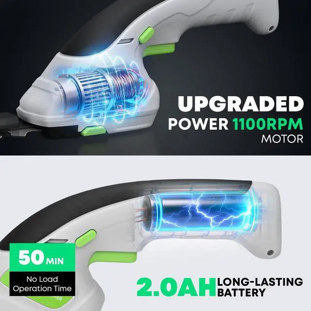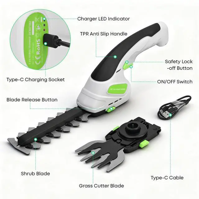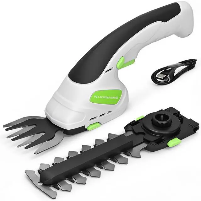 Precision Cutting in One ToolThis 2-in-1 tool combines cordless grass shears and a handheld hedge trimmer into one versatile device. It comes with dual sharp bladesa 4.72long shrub blade and a 3.15wide grass bladeenabling clean trimming of lawns, hedges, garden edges, dead plants, and small twigs. The hedge trimmer blade handles branches up to 0.31 thick. Simply swap blades in secondsno tools required, for your safety and convenience.