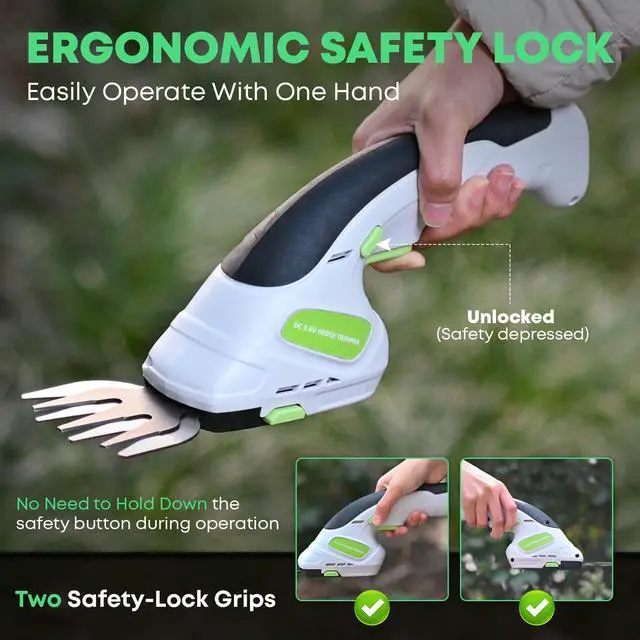Dual Safety Design: This cordless shrub trimmer features an ergonomic build with a dual safety lock mechanism. Simply press once to unlock before use no need to hold down continuously. This design provides reliable protection for both adults and children during operation.