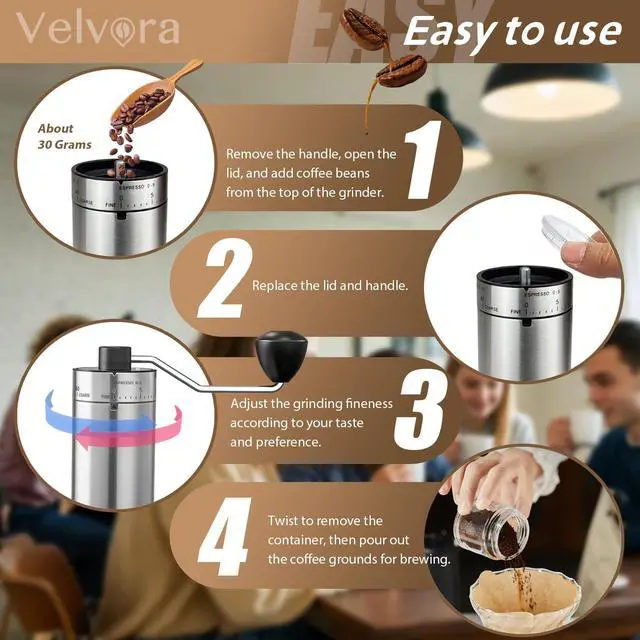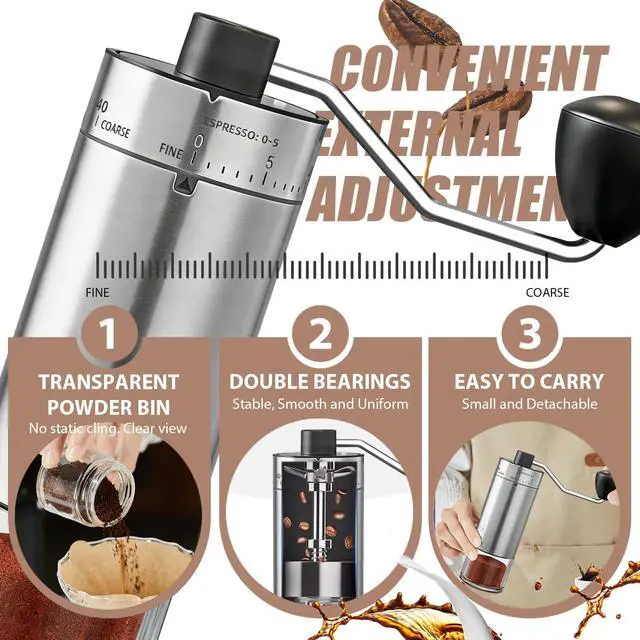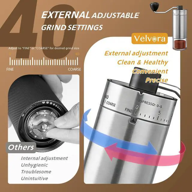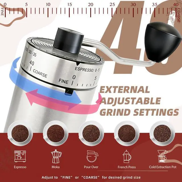 With 40 external adjustable grind settings, this manual coffee grinder works well for espresso, pour over, French press, AeroPress, and drip coffee. Easily switch from fine to coarse grinding to match different brewing styles.