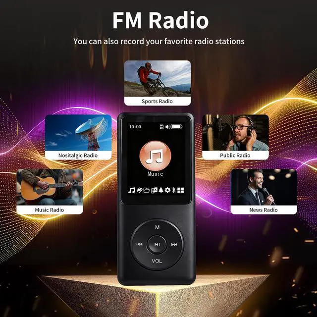 HiFi Lossless HD Sound and The MP3 player has built-in HiFi lossless HD speakers, supports wireless headphones to play music, and HD sound allows you to enjoy the music feast. Built-in allows you to listen to your favourite radio stations, plug in wired headphones as an antenna to search for more stations, so you can enjoy MP3 anytime & anywhere.