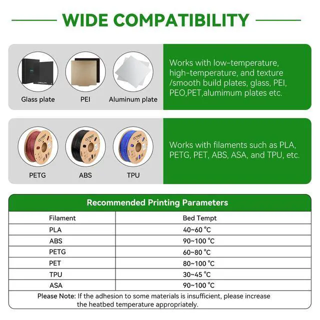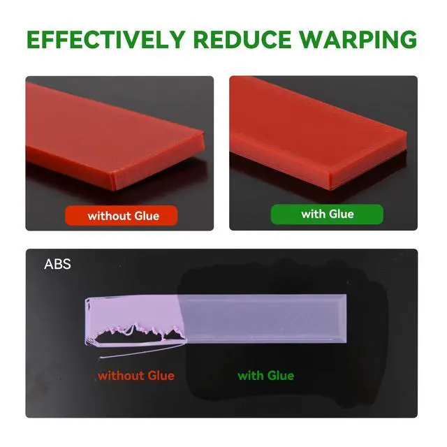 Wide CompatibilityIdeal 3d printer bed adhesion solution for PLA, PETG, PET, ABS, ASA, and TPU. Adheres well to diverse 3D printing surfaces such as low-temperature, high-temperature, textured/smooth build plates, glass, PEI, PEO, PET, Buildtak, and aluminum plates,etc.