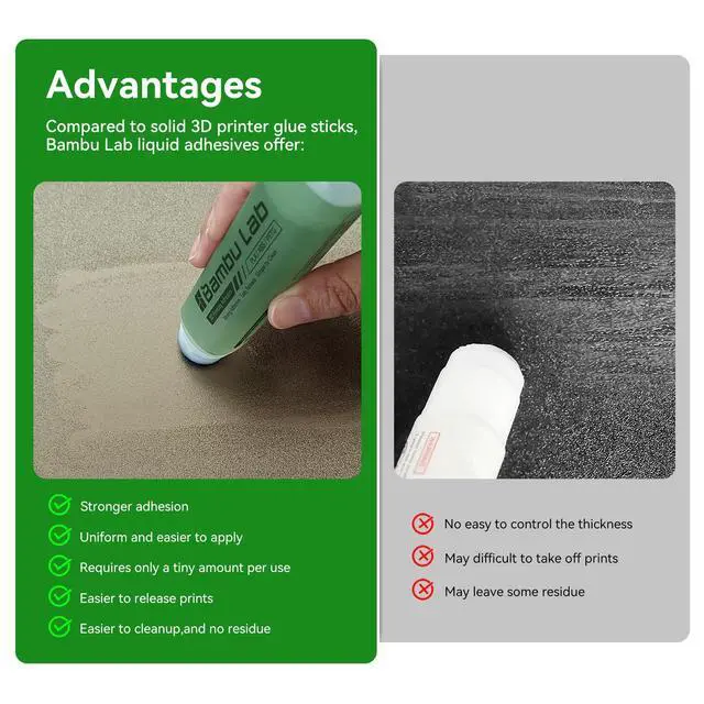 Easy to ApplyExperience a mess-free process with Bamboo Lab 3D print glue. Simply press the applicator head to open the valve and spread evenly over the printing area. Its liquid form ensures a more uniform and quicker application compared to solid 3d printer glue stick for hot bed.