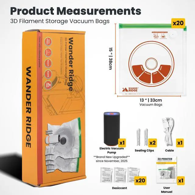 Complete Storage Kit - This filament vacuum storage bags kit includes everything you need for safe 3D printer filament storage: 20 vacuum storage bags (13 x 15 inches), 20 desiccants to absorb excess moisture, one auto vacuum pump for effortless sealing, and 2 clips to securely close the bags. Perfect for any 3D printer accessories collection.