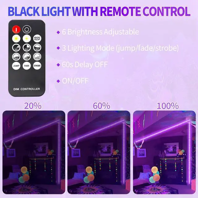Remote Control: Black light strip with a multifunctional remote offers 4 controls: 1. Adjust brightness in 6 levels (10%-100%) 2. Choose 3 dynamic modes (jumping/fading/blinking) 3. Enable 60-second delayed shutdown for energy saving 4.ON/OFF