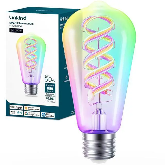 Spiral Filament LookThis ST19 Edison-style smart bulb features a visible 3D spiral LED filament, creating a decorative floating ribbon look even before you turn it on. The vintage glass shape is perfect for exposed sockets, pendant lights, cafés/bars, and clear glass shades, giving your lighting a premium, decor-forward feel while you switch colors, tunable whites, and scenes in the app or by voice