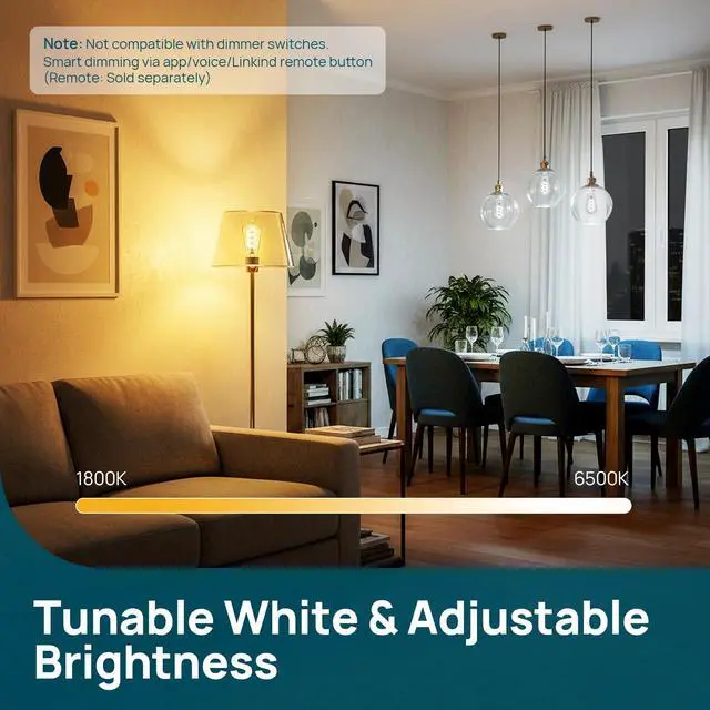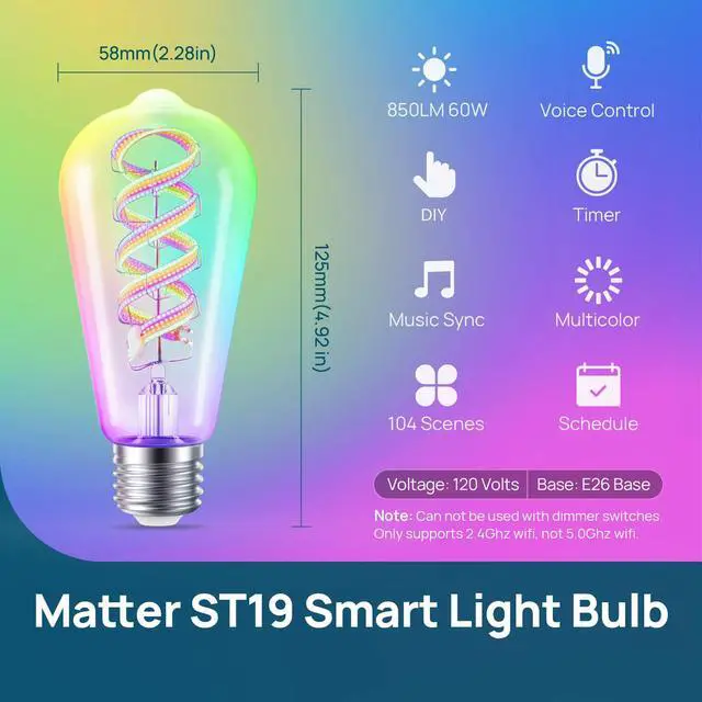 NOTEBefore you buy, please confirm fit: this is a ST19/ST58 E26 smart light bulb sized 2.28 in / 58 mm (diameter) × 5.04 in / 128 mm (height), ideal for pendant lights, table lamps, floor lamps, and open vintage-style fixtures where the bulb is visible. It supports 2.4GHz Wi-Fi only (not 5GHz). This bulb is not compatible with wall dimmer switches (may cause flickering/buzzing), so adjust brightness via the AiDot/Matter app or voice control and use a standard on/off switch