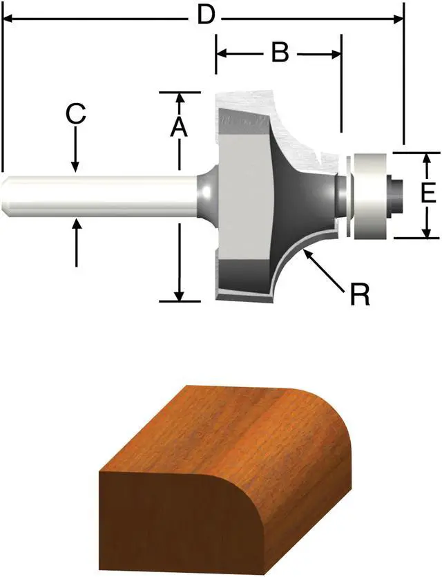 Vermont American Beading or Roundover Bit - Use to create decorative edging and drop-leaf table joints. Create beading profiles with corner round bits by exchanging the 1/2" bearing with a 3/8" bearing (included with bit). Carbide tipped. 1/4" shank. - Type: Roundover / Beading, Material: Carbide Tip, Overall Diameter: 5/8", Bearing Diameter: 1/2", Carbide Height: 5/16, Large Radius: 1/16", Shank Diameter: 1/4", Overall Length: 2"
