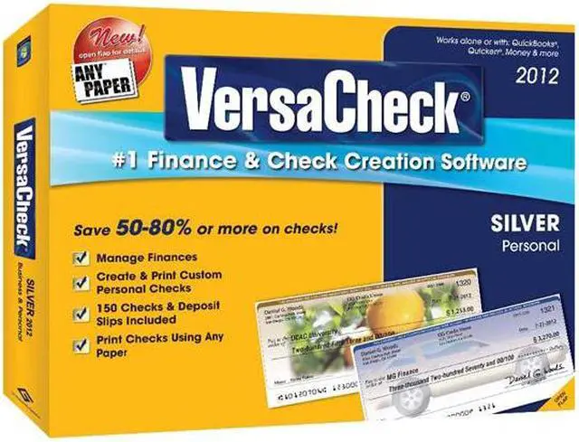 | Feature | VersaCheck Silver 2012 is the #1 Finance and Check Creation Software to create and print custom PERSONAL checks that comply 100% with ANSI X9 banking standards. This VersaCheck package includes the Silver 2012 software with 150 checks & deposit slips to get you started. Use VersaCheck Security Check Paper as your blank security check paper refill. VersaCheck Silver allows you to set-up and manage unlimited PERSONAL accounts. Use True Sign to save time by digitizing signatures for multiple accounts. Integrates seamlessly with QuickBooks, Quicken, and Money to exchange financial data and print directly on blank security check paper. New ANY PAPER feature lets you print checks using regular multipurpose paper to save over 90% vs. preprinted check paper! Pick and switch your favorite colors and check patterns at any time. Add effects and crisp custom images embedded with check security patterns. No more waiting, delivery cost or shopping for check paper stock. Manage Finances - Create & Print Custom PERSONAL Checks that comply 100% with ANSI X9 banking standards. Save 50-80% vs. buying pre-printed mail order checks, part of a complete line of 100% bank compliant check writing supplies. New ANY PAPER feature lets you print checks using regular multipurpose paper to save over 90% vs preprinted check paper. Windows 7 Certified, works stand-alone, also integrates seamlessly with QuickBooks, Quicken & Money. Revolutionary technology - Send & Receive Checks instantly online! Use TruSign time saving electronic signature manager. Software driven security icons with validated paper and ink. Works with inkjet & laser printers. |