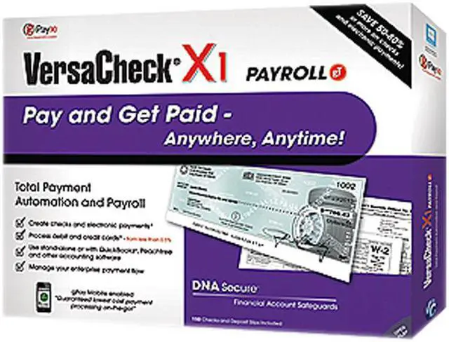 | Feature | Works with America's #1 Online Payroll Service ($25 or $39 per month service fee) and includes 1 month free. VersaCheck X1 Payroll gT allows you to create and print custom checks, print directly from any accounting package, manage all your finances, and process incoming and outgoing payments. Features: - NEW! VersaCheck Pay for PC and Mobile Devices - Create & Print DNA Secure Checks! - Protect Your Accounts & Receive Activity Alerts - Automatic paycheck calculations include earnings, tax & voluntary deductions - Get email reminders when federal tax deposits and tax filings are due - Includes state forms for all 50 states - Free phone support from payroll experts - Create Custom PAYROLL & Payables Checks - Print paychecks on blank stock and save 50%-80% - Print with Inkjet and Laser Printers Includes: - VersaCheck X1 Payroll gT Software - Free online Payroll service (a $35 value)* - 150 Blank Checks and Deposit Slips |