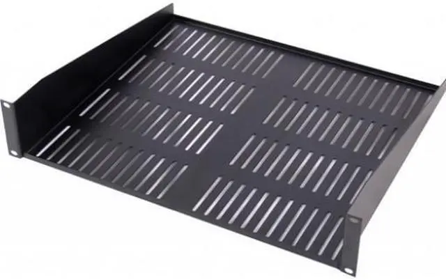 2U Vented Shelf, 19" Rack mountable. 1 piece Vented single-sided shelves are center mounted between the upright rails of all standard 19 panel width open racks, server enclosures and network enclosures.