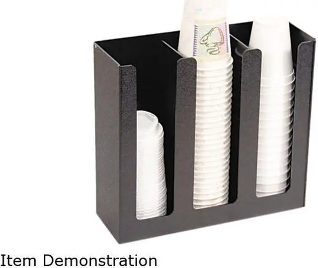 Provides easy access to cups and lids. Three 12" high columns hold cups from 8-oz. to 32-oz. size. Nonskid tabs on base keep cup holder secure on counter. Commercial-grade construction will not crack, fade or chip. Includes compartment identifier decals.