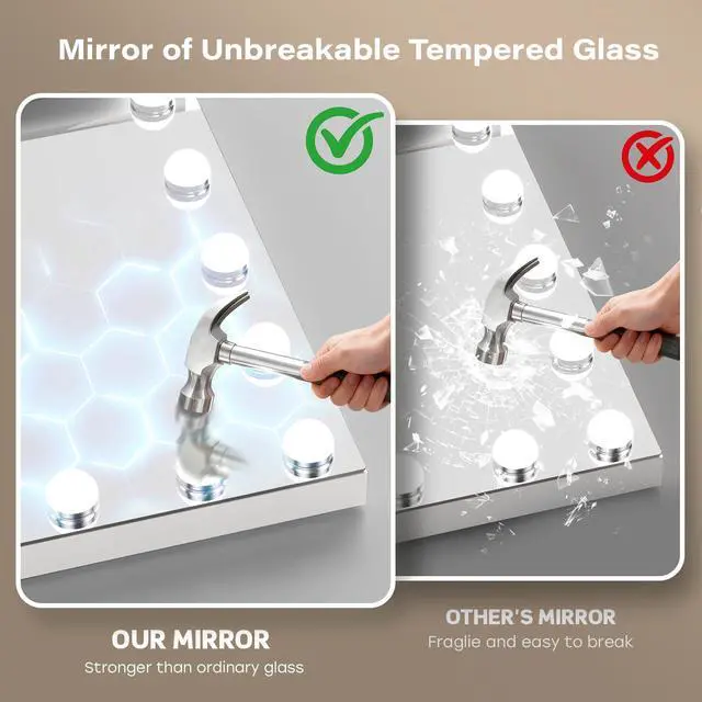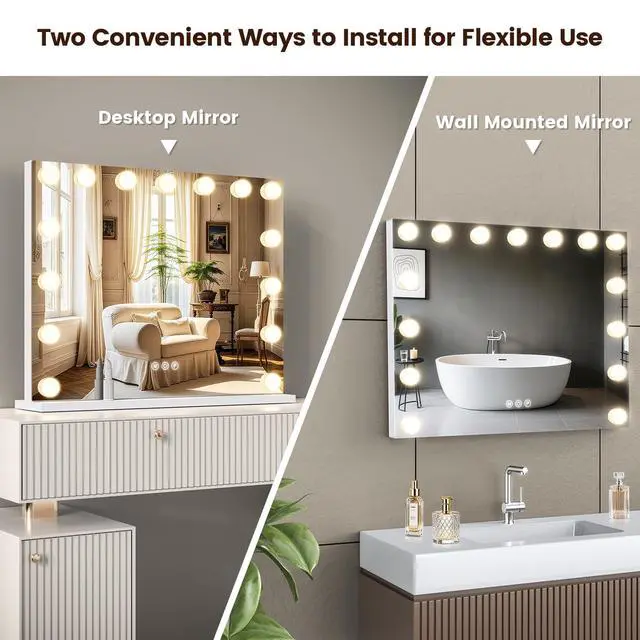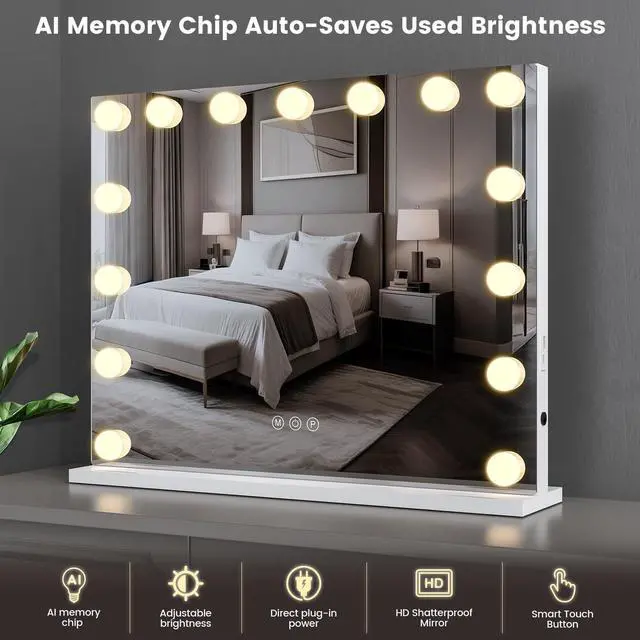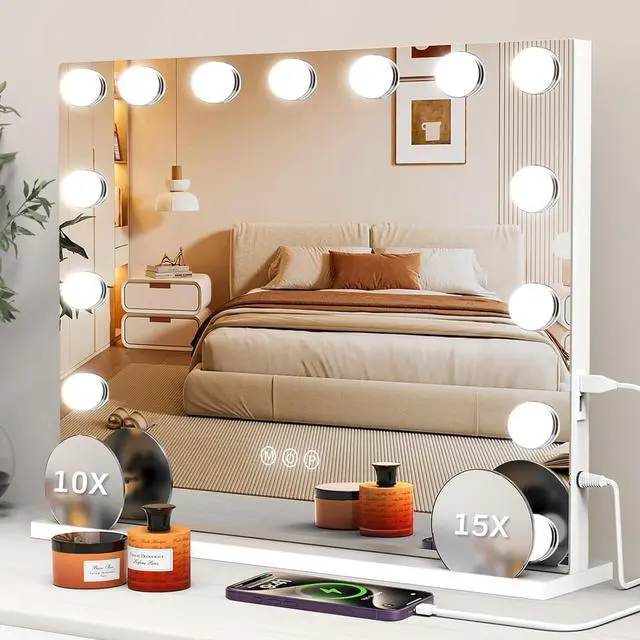 Specifications Magnification: 10X/15X LED Bulbs: 15 dimmable LED bulbs Color Modes: 3 (warm, natural, cool) Control Type: Smart touch control Function: Memory function Design: Tabletop with storage tray, sturdy metal frame Package Includes 1 x Large Vanity Mirror with Lights 1 x User Manual [Any additional accessories, such as power adapter] Customer Support We are committed to providing excellent customer service. If you have any questions, concerns, or issues with your mirror, please don't hesitate to contact our friendly and knowledgeable customer support team. We're here to help you make the most of your purchase and ensure your complete satisfaction. Upgrade your beauty routine today with our Large Vanity Mirror with Lights. Experience the difference that professional - quality lighting, magnification, and smart features can make in your makeup application. Order now and bring a touch of Hollywood glamour to your dressing space!