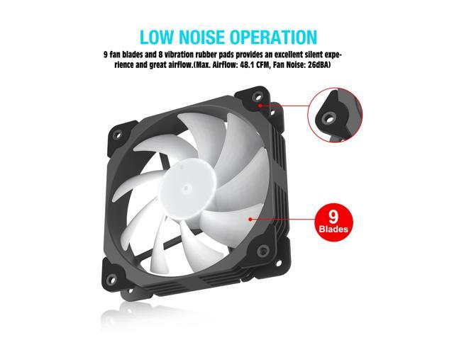 - Low Noise Operation: 8 vibration rubber pads and PWM speed adjust provides an excellent silent experience and great airflow.(Max. Airflow: 48.1 CFM, Fan Noise: 26dBA)