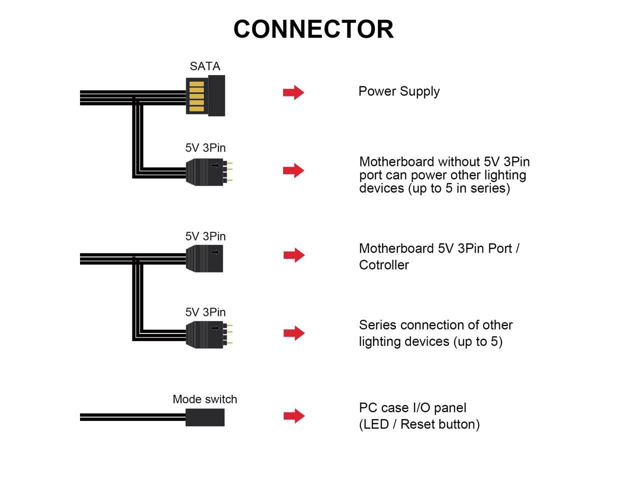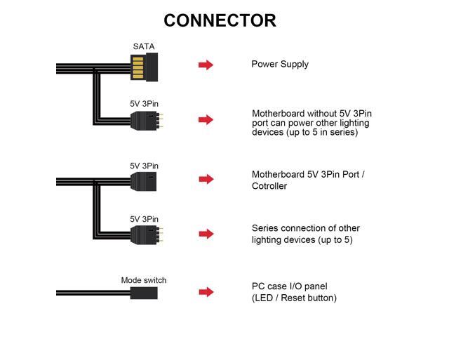 - Connector: 2 x 5v 3pin, switch , SATA.
