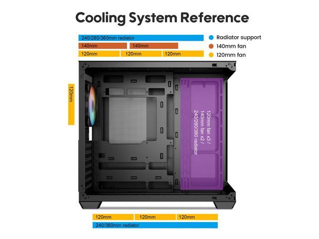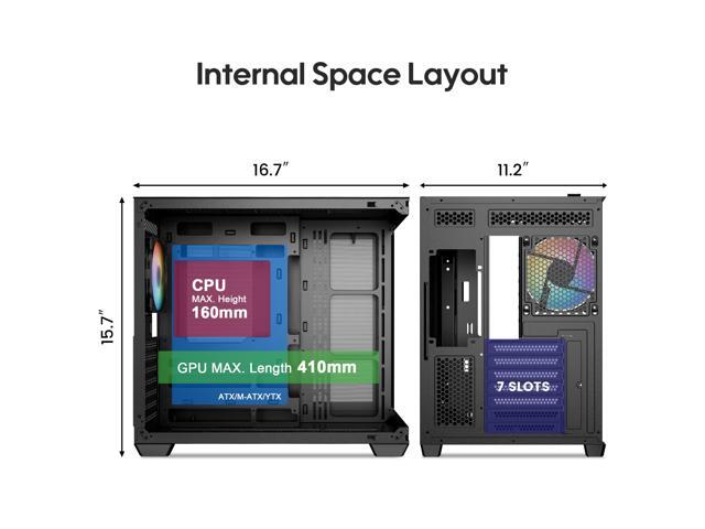- Case Space Wide Compatibility: Support up to 360mm liquid cooling radiator in top and 10 x 120mm fans. ATX, M-ATX and YTX motherboard support, max GPU length 410mm and PSU up to 200m. Fits all RTX 40 and R7 series graphics cards.