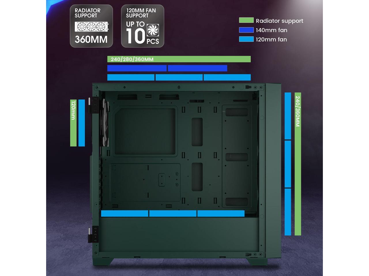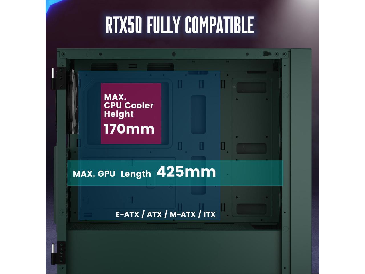 - Wide Compatibility: Support up to 360mm liquid cooling radiator in front/top and 10 x 120mm fans. Support E-ATX, ATX, M-ATX, ITX motherboard, max GPU length 425mm and fits all RTX 50 series graphics cards.