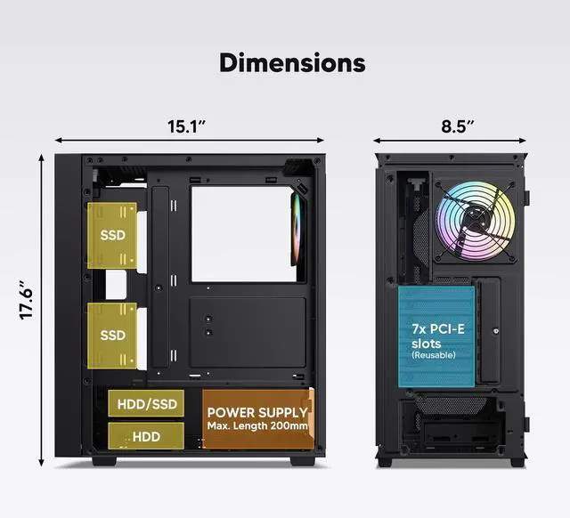 • Wide Compatibility: Support up to 360 mm liquid cooling radiator in front and 8 x 120 mm fan. Support ATX, M-ATX, ITX motherboard, max GPU length 340 mm and fits RTX 50 series graphics cards
