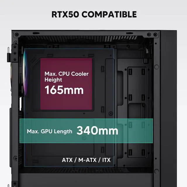 Wide Compatibility: Support up to 360 mm liquid cooling radiator in front and 8 x 120 mm fan. Support ATX, M-ATX, ITX motherboard, max GPU length 340 mm and fits RTX 50 series graphics cards