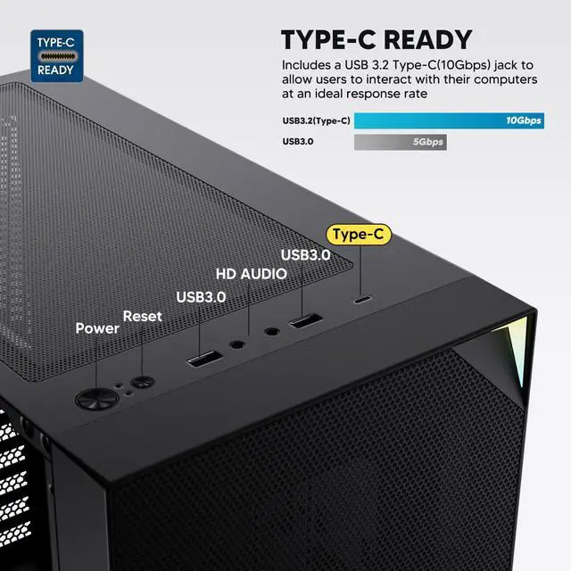 Powerful I/O Panel: Type-C port, 2 x USB 3.0, Microphone/headphone combopower, and reset