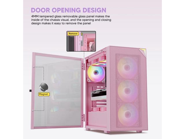 - Door Opening Design: Equipped with 4mm thick tempered glass, can clearly see the ARGB lighting and the components inside the case. The convenient door opening design makes it easier for you to assemble the interior of the case