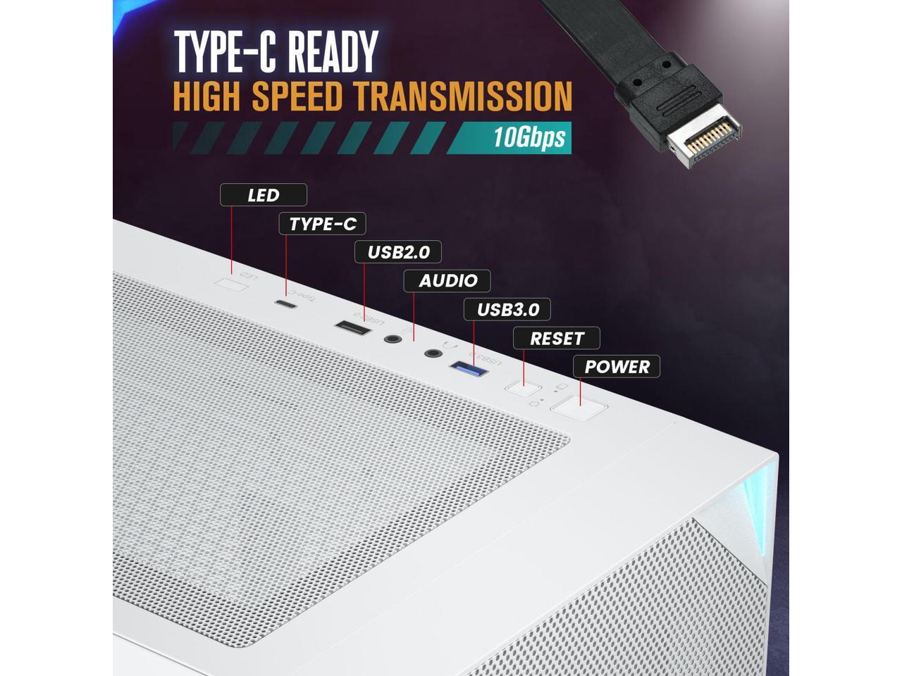 Powerful I/O Panel: Microphone/headphone combo, 1x USB 2.0, 1x USB 3.0, Type-C port, power, reset and expedient led button.