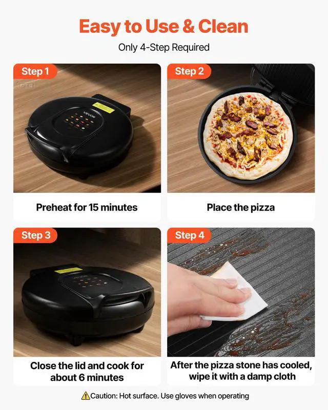 Designed with a non-stick coated pan, VEVOR electric pizza maker ensures efficient heat retention and even heat distribution for consistently crisp pizza bases.