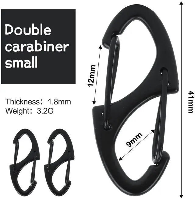 SIZE DETAILS - This set of double carabiners can be used to quickly and reversibly connect your stuff, but please keep the following measures in mind: The overall length is 1.6inches (41mm), the width is 0.6inches (15mm), and the thickness is 0.07inches (1.8 mm). Also, the spring is small (7mm), so it cant withstand heavy loads.