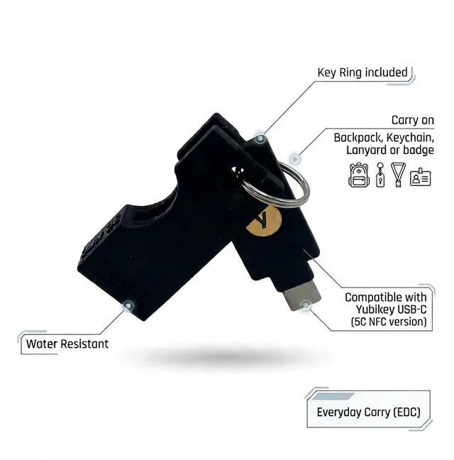 Designz3D manufactures purpose-built 3D printed accessories engineered for strength and real-world performance. This YubiKey keychain holder is produced using industrial grade 3D printers for enhanced structural durability and a secure, dependable fit for everyday carry. Designed to help protect and hold your device with confidence, each piece reflects our focus on precision, consistency, and long-term reliability. All products are designed and manufactured near Seattle, WA, with careful attention to quality and workmanship.