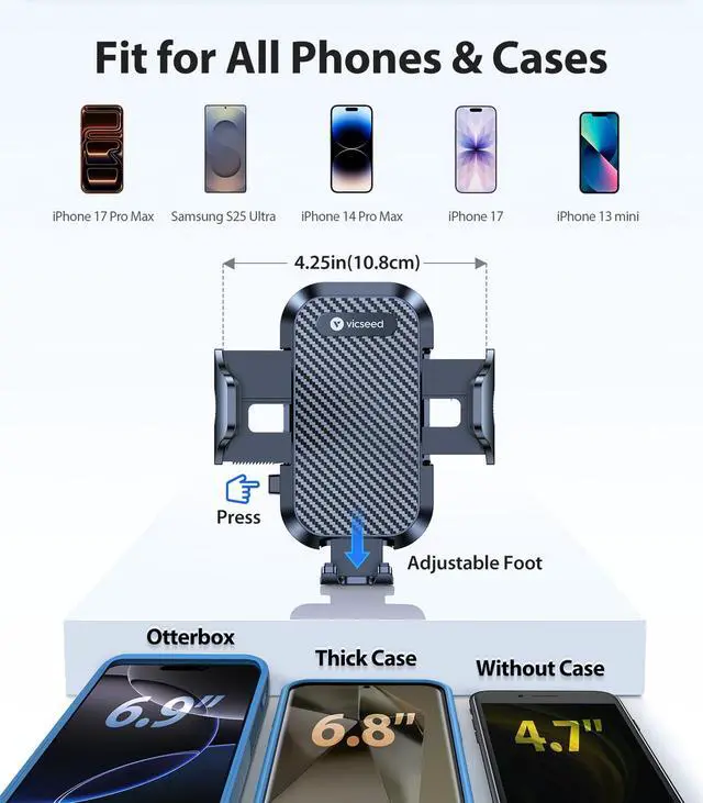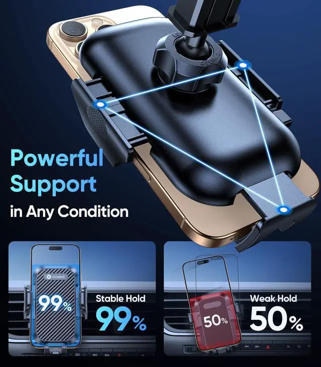 In 2026, VICSEED redefines the ultimate rock-solid stability experieInce! We have eliminated the six deadly flaws of ordinary mounts: phone crashes during sudden brakes, scratched interiors, blocked sightlines, broken vent blardes, melted adhesive in heat,and tilted screens in landscape mode.