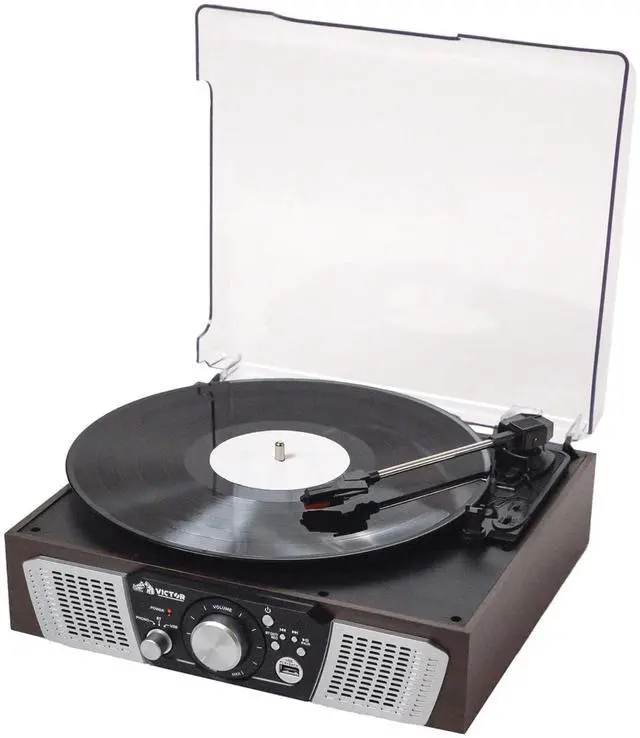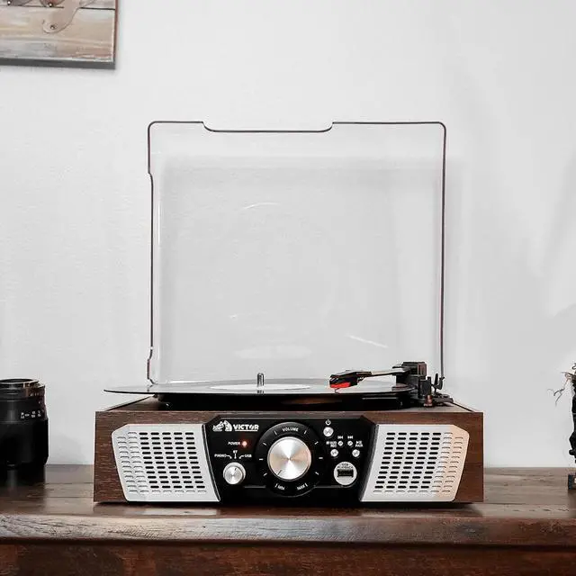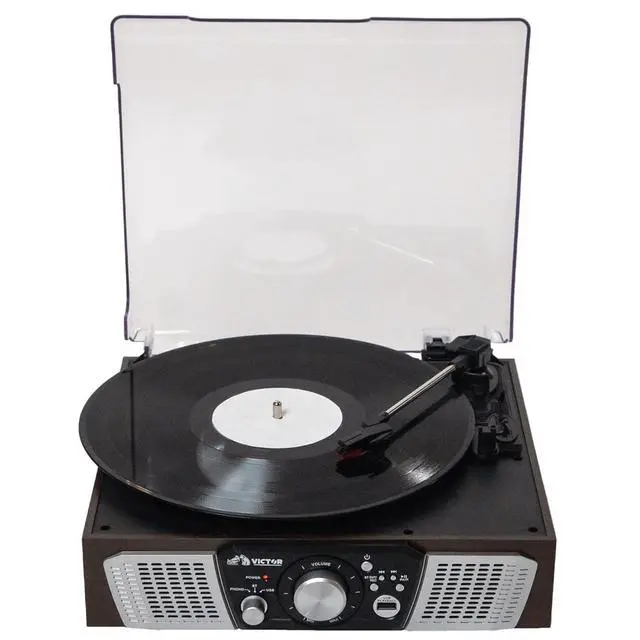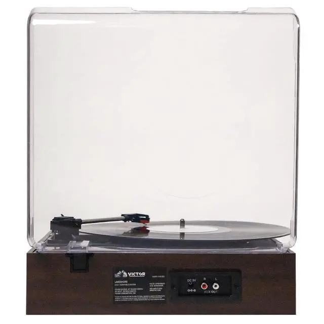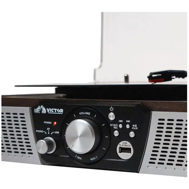 The Victor Lakeshore 5-in-1 Turntable System blends classic vinyl playback with modern audio versatility, featuring a built-in 3-speed turntable to enjoy your favorite records. With dual Bluetooth functionality, you can stream music from your smart device through the Lakeshores built-in stereo speakers or transmit vinyl playback wirelessly to an external Bluetooth speaker. It also offers USB input for easy one-touch recording and playback, along with a 3.5 mm aux input and RCA audio output for even more connectivity options. This all-in-one system includes a UL-approved power adapter, user manual, and quick setup guide.