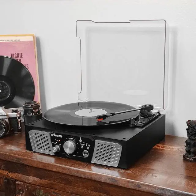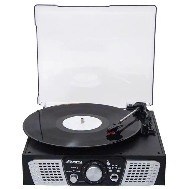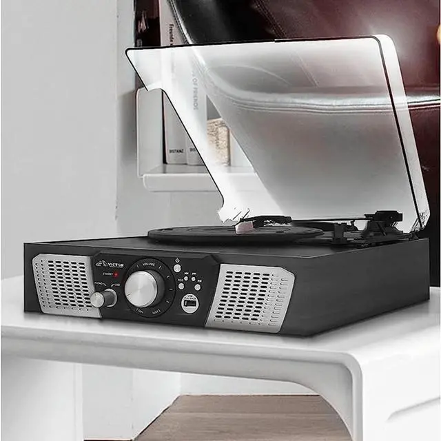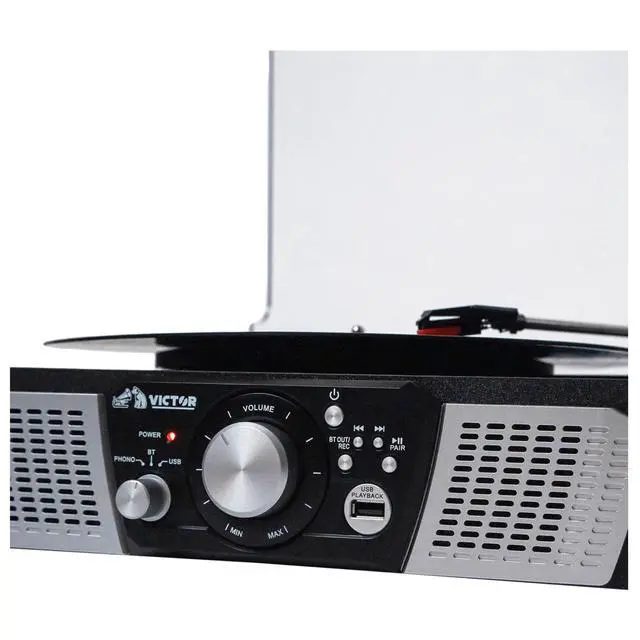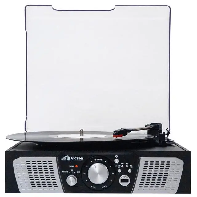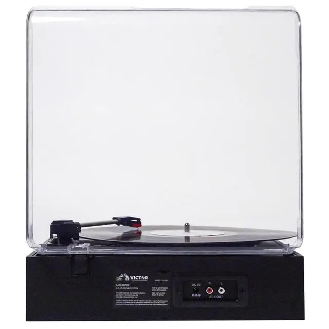 The Victor Lakeshore 5-in-1 Turntable System blends classic vinyl playback with modern audio versatility, featuring a built-in 3-speed turntable to enjoy your favorite records. With dual Bluetooth functionality, you can stream music from your smart device through the Lakeshores built-in stereo speakers or transmit vinyl playback wirelessly to an external Bluetooth speaker. It also offers USB input for easy one-touch recording and playback, along with a 3.5 mm aux input and RCA audio output for even more connectivity options. This all-in-one system includes a UL-approved power adapter, user manual, and quick setup guide.