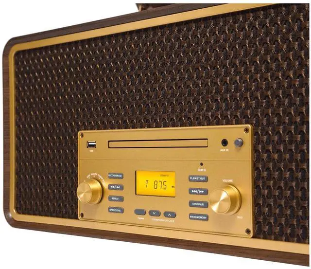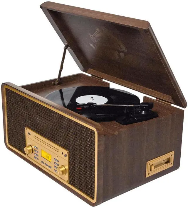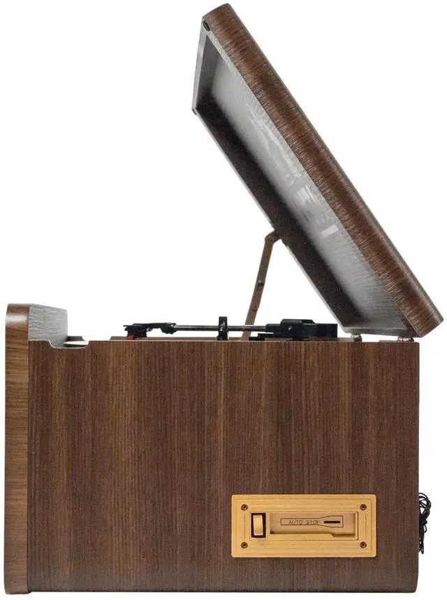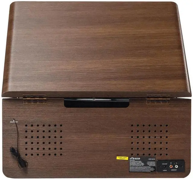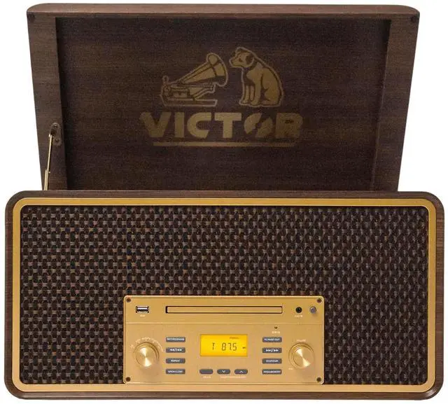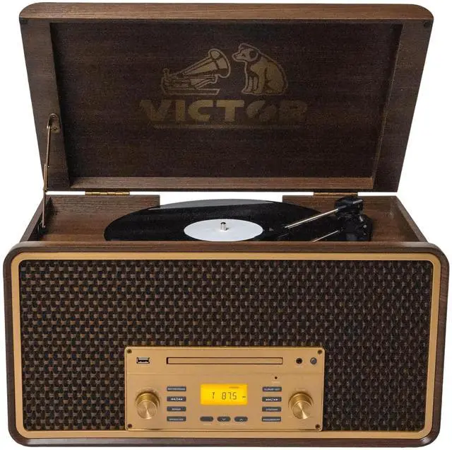 The Victor Monument 8-in-1 Music Center features solid wood construction with a great Retro Design. The built-in 3-Speed Turntable, CD and Cassette Player, and AM/FM Radio are ready to play all your favorite songs! The Dual Bluetooth feature allows streaming of your vinyl records to an external Bluetooth Speaker or plays music from your Smart Device through the Monument's built-in Speakers. Placing a thumb drive into the USB Slot allows Recording and Playback from your Albums, CDs, or Cassettes.