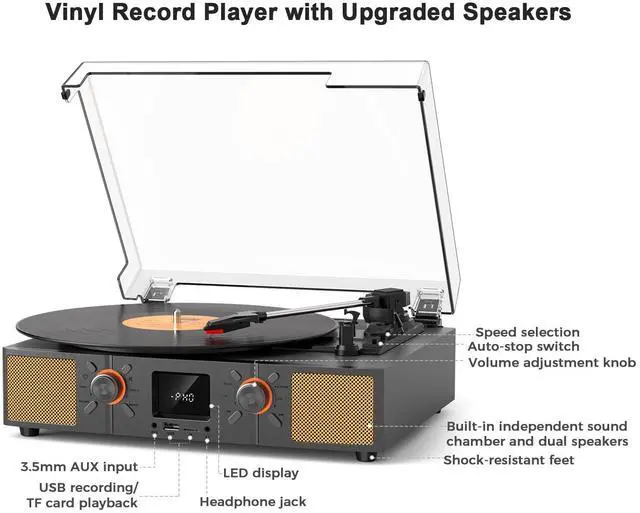 High-Definition LED Display and USB Recording FunctionThis turntable features a built-in LED display for easy operation and viewing of playback status. It also supports USB recording, allowing you to directly transcribe audio from vinyl records into digital files for convenient storage and sharing.