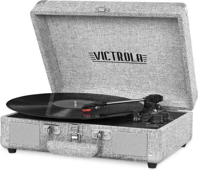 Journey Bluetooth Portable Suitcase Record Player with Built-in Speakers, 3 Speed Vinyl Record Player, RCA Out, Headphone Jack (Light Gray)