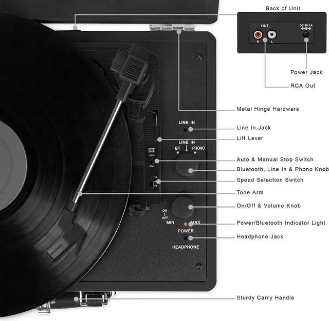 This 3-speed (33 1/3, 45, 78 rpm) suitcase record player features UPGRADED PREMIUM SOUND QUALITY and sits on sound isolating feet