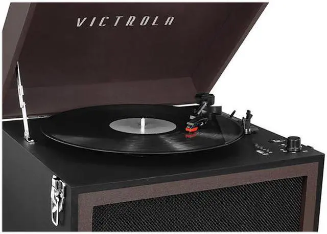 | Feature | The Victrola Bluetooth Record Player Stand combines modern design and technology. Perfect for vinyl lovers with its 3-speed turntable, but also features FM Radio, USB Player + Recorder or stream music from your tablet or MP3 using Bluetooth! Victrola Bluetooth Record Player Stand with 3-Speed Turntable. |