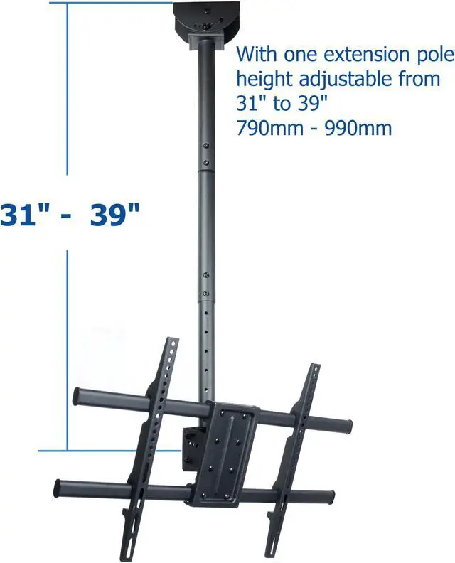Specialized in high-quality, well-designed mounting solutions, VideoSecu supplies easy-installed mount at cost-effective prices. The ceiling mount MPC53B2 fits most 40 - 65 inch TVs, some LED up to 70 inch with VESA mounting holes patterns up to 700x405mm. This TV ceiling mount is constructed with high grade steel providing reliability and durability. It provides optimum viewing positions with 15 degrees tilt forward or 5 degrees backward and 360 degrees pan. The height adjustment can be made in 1.5 inch increments to meet your specific needs. The adjustable swivel design makes it flexibly fit flat ceiling, vaulted ceiling.