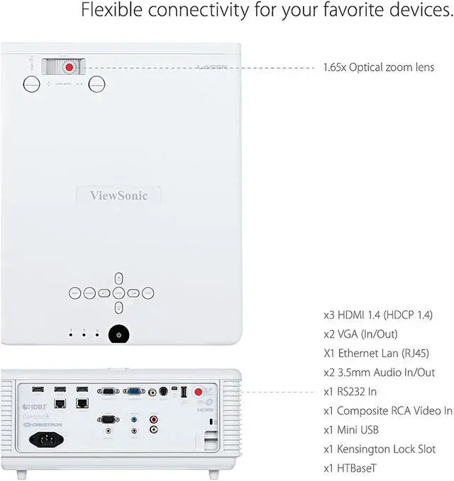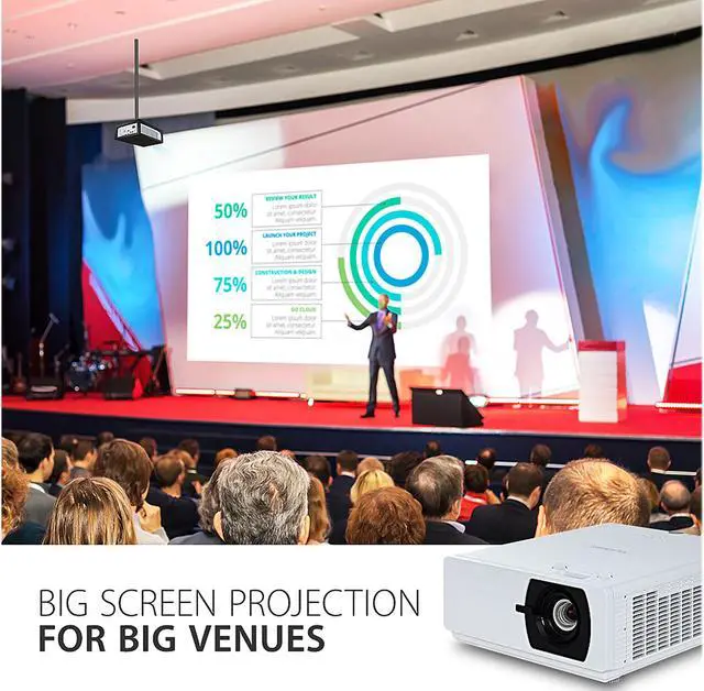 Bright and versatile for any professional installation, the ViewSonic® LS900WU WUXGA laser projector delivers everything you need for big screens in big venues. Delivering 6,000 lumens of advanced high brightness, 100,000:1 contrast ratio, and up to 30,000 hours* of light source life, this projector is ideal for auditoriums, lecture halls, large boardrooms, houses of worship, and more. Thanks to SuperColor™ technology, content is brought to life with captivating color, crisp graphics, and stunning videos no matter the environment. This top-notch performer is also easy to deploy and manage with its wide 1.65x optical zoom adjustment, vertical/horizontal keystone, 4 corner adjustment, and a vertical/horizontal lens shift feature that provide extreme flexibility in even the most challenging installations. Thanks to the built-in HDBT receiver, the projector is capable of receiving uncompressed HD video and audio from over 200 feet away via network cable. Moreover, 360-degree tilt angle projection, portrait mode, and 24/7 operation allow for extreme mounting flexibility. The ViewSonic® LS900WU is the ideal WUXGA laser projector for professional installations, large venues, and business and education environments.