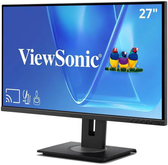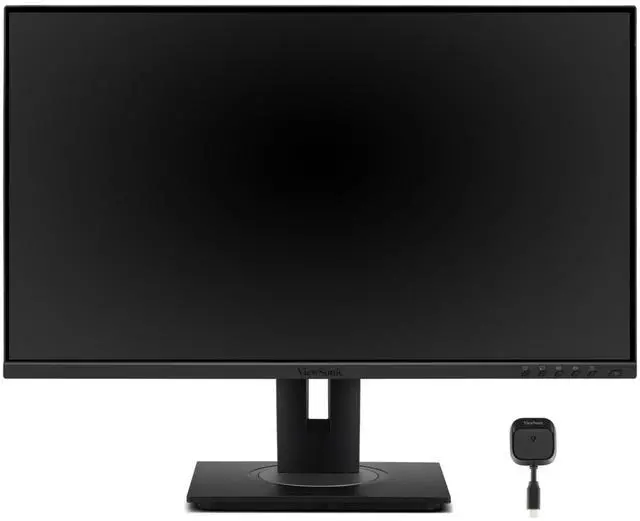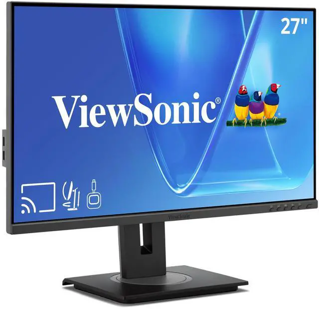 The ViewSonic (r) VG2748N monitor delivers a streamlined, cable-free workspace experience. This 27" Full HD IPS display features integrated WiFi technology enabling effortless wireless casting via Miracast and Airplay, while the included ViewShare dongle can support 65W USB-C power delivery when connected to a power source-keeping devices charged without extra cables. For added flexibility, the monitor includes HDMI, DisplayPort, and VGA inputs for connecting other devices, along with a built-in USB hub for accessories. An advanced ergonomic stand supports tilt up to 40 degrees, swivel, pivot, and height adjustment for all-day comfort.